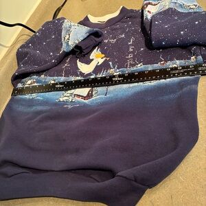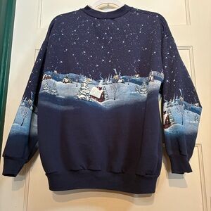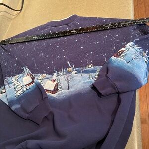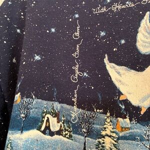 I admire the artistry and quote of this vintage Made in USA in Glen Flora, Wisconsin, Christmas sweatshirt. Could be considered an Ugly Christmas sweatshirt due to size of design spreading from the front, encompassing the sleeves, and culminating in the back. Party goers may ask you to turn slowly and hold up your arms.