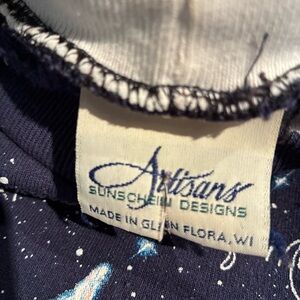 Condition is preloved and may show signs of wear consistent with age. There is pilling, some crackle, and a few discoloration spots on the inside crew neck collar and also on the bottom front.