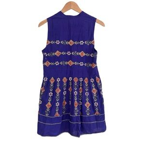 Maeve by Anthropologie Ionia tunic top in a rich purple cotton with intricate embroidered and beaded detailing throughout. Sleeveless silhouette with a flattering fitted bodice and gently flared tunic length.