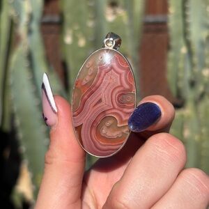 This stunning pink agate pendant necklace is a perfect addition to any jewelry collection. The unique patterns and elegant design make it a standout piece.
