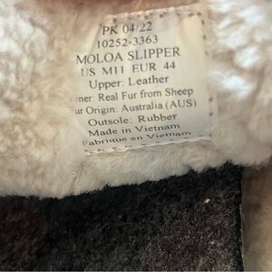 Men’s OluKai Moloa slip-on slippers in good used condition. Soft leather upper with genuine shearling (real sheep fur) lining for warmth and comfort. Rubber outsole for indoor/outdoor wear. Some visible scuffing consistent with normal use—please see photos for details.