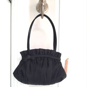 Super cute with bow and pleating. Large inside snap closure and one pocket. Wear as a crossbody or on your wrist. NEW WITH TAGS
