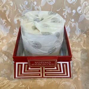 Enhance your home decor with the Remarkable Red Decorative candle. Featuring a striking red and white geometric design, this piece adds a touch of elegance to any room.