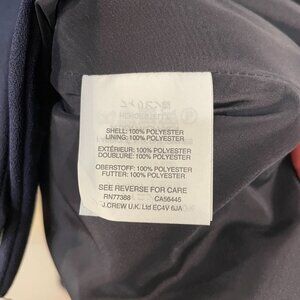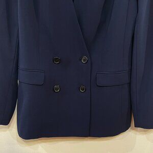 J.Crew suit jacket featuring a collarless design, double-breasted button closure, flap pockets (still sewn in), functional button cuffs, satin lining, and a light to mid-weight wrinkle-resistant polyester crepe fabrication. Versatile navy blue