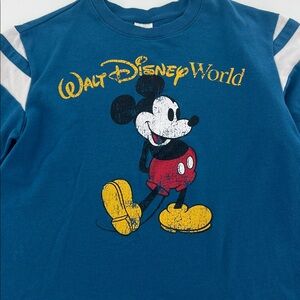 Teal sweatshirt featuring Mickey Mouse. Walt Disney World logo in yellow. White stripe details on sleeves.