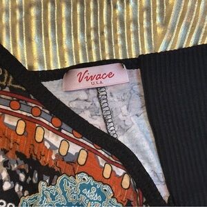 Vibrant long sleeve top with intricate patterns. Features shades of blue, orange, and black.