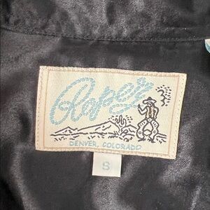 Black poly blend embroidered western dhirt with pearl snap closure and sleeves. Mid 90’s
