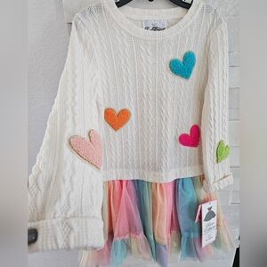 Charming sweater dress with vibrant heart accents. Features a multicolored tulle skirt.