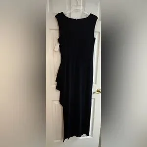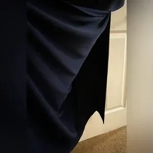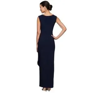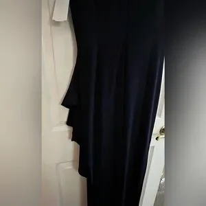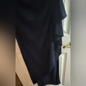 Alex Evening embroidered illusion gown. Chic navy dress with cream lace detailing. Sleeveless design. Perfect for elegant events. Size 10P, 59” in length, 23” side slit, ptp 19”, ruffled side, back conceal zipper