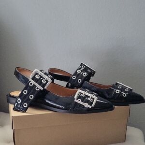 Chic Graya flats in black with bold silver buckles size 10. fit is true to size. EUC, worn 2x for events. slight wear on bottom, see picture. Perfect for a bold stylish look in the office and at parties! Great deal. Originally $100.