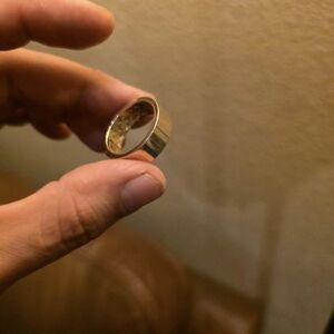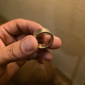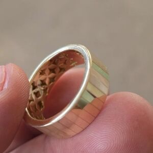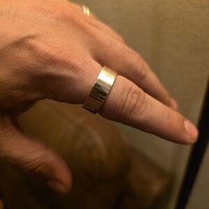 Ring has a minor dent. You really have to zoom in to notice it. Or if you rotate it - no one can see it. Ring has been used a every day use ring. Its not small or petite. Its a good size ring . Looks more like a wedding band ring. But can be use as everyday causal use.