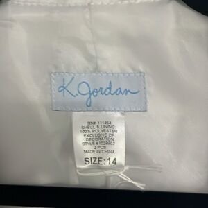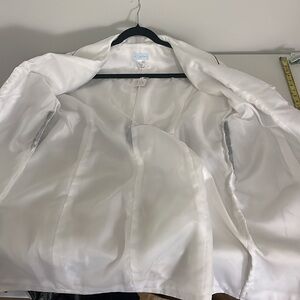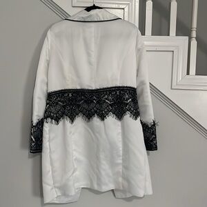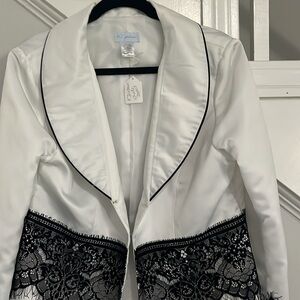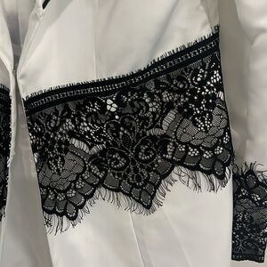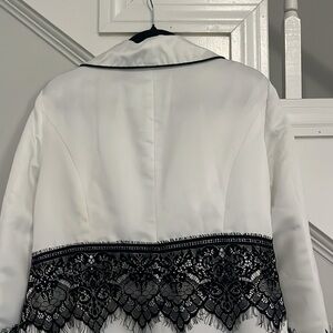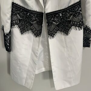 This elegant women's coat features a sophisticated white design with intricate black lace detailing. Perfect for adding a touch of class to any outfit.