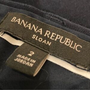 Banana republic Sloan, navy pants. Size 2, made in Jordan. Machine washable, in good used condition. Cotton, rayon & spandex blend. Pockets in the front & back, see photos. Rise 8 1/2 inches, waist measures 15 1/4 inches across & inseam is 26 1/2 inches.