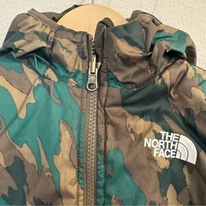 Camouflage jacket with hood. Features The North Face logo on chest.
