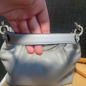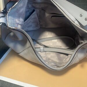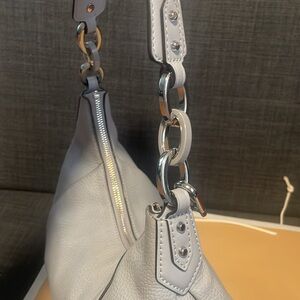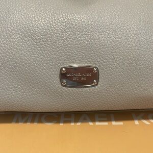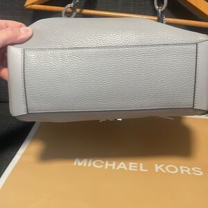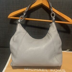 Elegant Michael Kors shoulder bag. Features a sleek gray design. Silver hardware accents. Perfect for any occasion.
