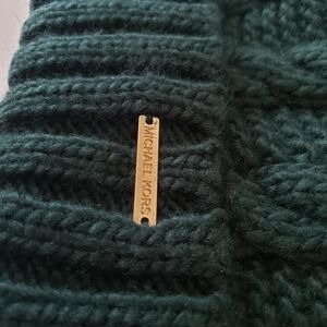 Stylish teal knit hat with a fluffy pom-pom. Features a gold logo accent. Perfect for cold weather.