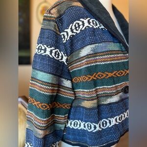 This piece is a total showstopper! 100% cotton— super sturdy with a magnitude of different patterns/weaves to admire. Muted earth tones all over. Almost an Aztec pattern. Boasts a beautiful rounded collar and cropped fit. In fantastic vintage condition! 🪺🌾🍂