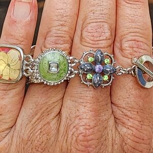 Charming bracelet with floral designs. Features silver and turquoise elements. Perfect for any occasion.