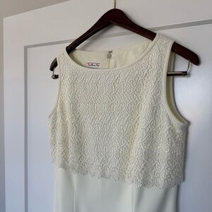 Elegant Talbots sheath dress in a beautiful soft ivory tone. Features a stunning embroidered lace overlay on the bodice with delicate scalloped edges, paired with a clean, tailored skirt for a timeless and flattering silhouette.