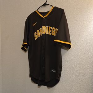 Great Condition - Brown Nike MLB jersey with yellow 'San Diego' text. Button-up front. Short sleeves with yellow trim.