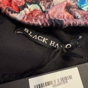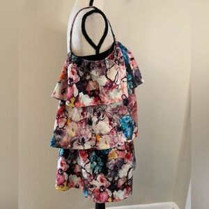 Black Halo Ruffled Tiered Mini Dress. Features a Multicolored Abstract Artsy Floral Print with a Dynamic abstract design with vibrant hues. Features red, orange, and pink tones. Built in black bra, soft stretch elastic chest band, spaghetti straps and a comfy cotton, polyamide & elastane blend and a polyamide elastane lining. The stitching of one hanger shoulder strap unstitched in one side. Please see photo. Does not affect wear. SZ XS.