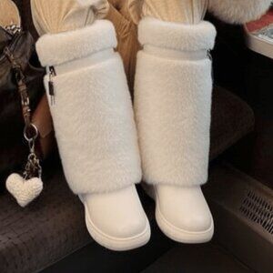 These beige outdoor knee snow boots feature a fluffy fuzzy exterior that traps heat while the waterproof shell keeps feet dry in deep snow. A high‑cut design provides extra coverage, and the insulated lining adds warmth for long days on the trail. Rugged, slip‑resistant soles deliver reliable traction on icy surfaces, and the snug fit ensures stability without sacrificing movement. Ideal for winter adventures where comfort and protection are essential.