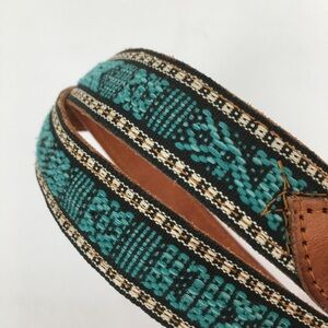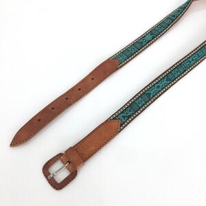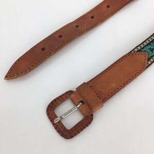 This accessory features a brown leather belt with a rustic finish, complemented by a striking turquoise center strip. The intricate silver-toned studs and beading add a touch of elegance, making it a perfect addition to any outfit.
