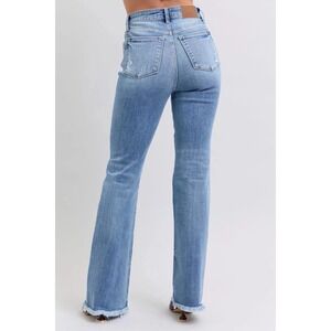 Judy Blue The Gloria high rise bootcut denim jeans. These jeans feature a medium blue wash with distressed detailing and a frayed hem. The bootcut silhouette offers a classic and flattering shape. The high rise provides comfortable coverage.