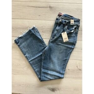Keywords: bootcut jeans, high rise denim, distressed jeans, frayed hem, medium wash, bootcut, denim, womens jeans, classic, modern, flattering, bell bottom