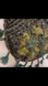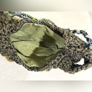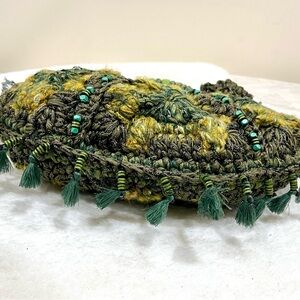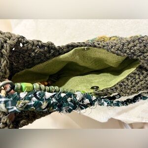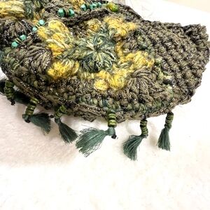 Handmade crochet bag in earthy green tones with textured stitch work. Finished with bead details, tassel accents, and a braided fabric strap. Soft, lightweight, and easy to wear.