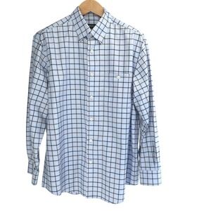 Orvis men's long sleeve button-up shirt in a light blue windowpane plaid. This classic collared shirt features a chest pocket with button closure and a full button front. Perfect for casual wear, outdoor activities, or a relaxed office environment.