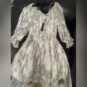 ❤️ Elie Tahari snake print dress in neutral taupe/cream. New with tags. Flowy maxi silhouette with smocked elastic waist, gathered neckline, and puff sleeves.