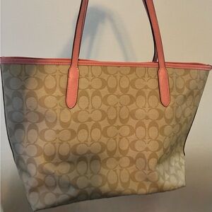 Chic Coach tote in beige with pink handles and fun patch details for a playful, stylish look. There is a small white mark inside the bag, shown in photos. A great everyday tote—perfect for moms, Early Childhood Special Education teachers, or preschool teachers. Price is negotiable.