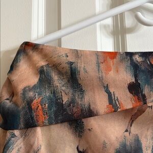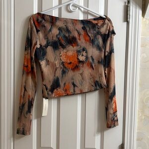 Stylish off-shoulder crop top with artistic print. Features vibrant orange and black hues. Perfect for a chic look. Beautiful fabric and print. Polyester and Elastane. A netting, sheer fabric. Measures 17” across. Has a lot of stretch. Hand-wash. Brand new and in Excellent Condition. Last pic shows the sheerness of the garment.