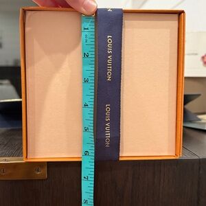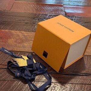 2025 Holiday Louis Vuitton bag with Iconic LV Orange box with navy ribbon and gold tag. Elegant navy bag with gold accents.