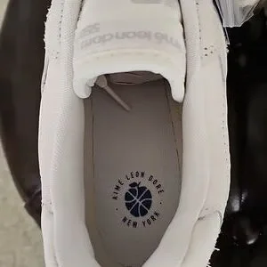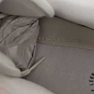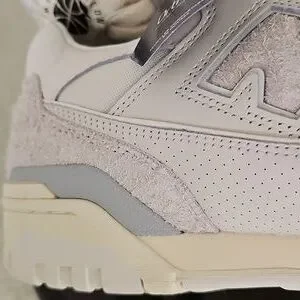 Features a mix of off white and white leather suede paneling.