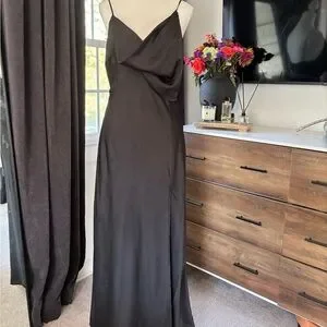 Elegant black satin maxi dress. Features a draped neckline and spaghetti straps. Perfect for evening wear.
