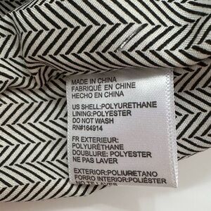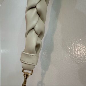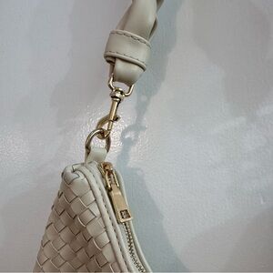 Vegan leather, woven details, braided handle, and gold tone hardware. Zipper closure. Color is bone.