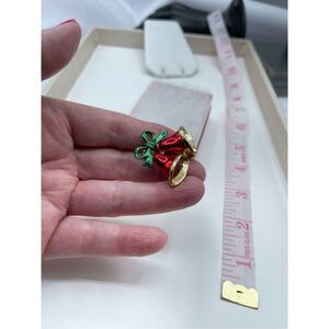 Charming holiday bells done in green and red enamel. Gently worn with Minimal signs of wear. Big bow on top of two red holiday bells.