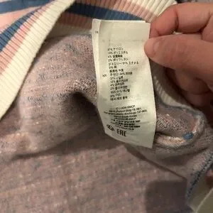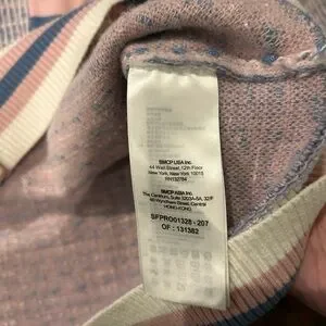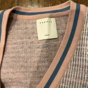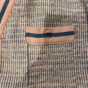 Elegant knit cardigan with pink and blue accents. Features a classic design. Pocket buttons are missing, which is why the price is set low. Size 3 or M.