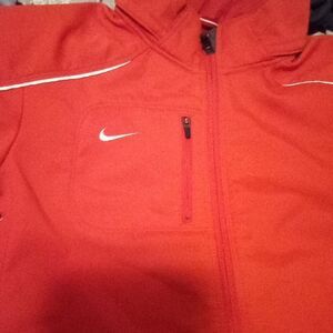Super nice bright red softshell jacket with white piping one zip chest pocket, 2 front side hand pockets, underarm vents and removable zipper hood. inside is soft gray felted fabric size S (4-6) measures flat 18" pit to pit 24" long in excellent, clean condition no visible flaws