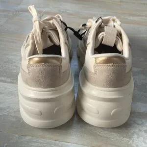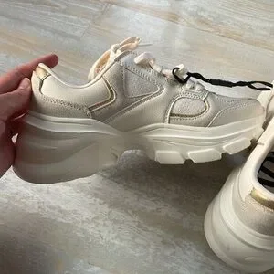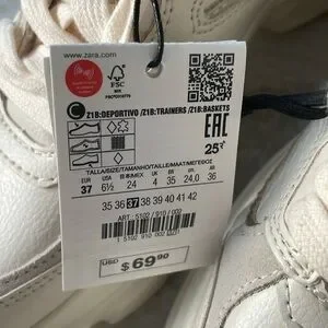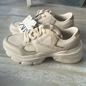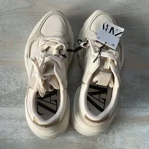 Step out in style with these chic cream sneakers from Zara. Perfect for any casual outing, these shoes offer both comfort and elegance.