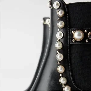 Stylish black ankle boots with elegant pearl accents. Features a sleek design and comfortable block heel.