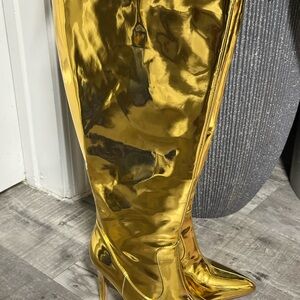 Striking metallic gold boots. Over the knee style. Adds glamour to any outfit.