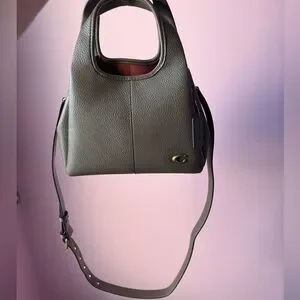 Elegant Coach crossbody bag. Features a sleek tan design. Gold-tone hardware accent.