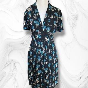 This 1995 Vintage Anna Sui wrap sundress showcases a beautiful primarily back and blue color pallet, florals and faces, a plunge neckline, notched collar, short sleeves and a flattering midi length.
