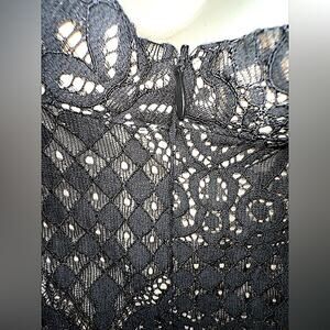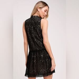 Lulus Exclusive! Amp up your cocktail hour look with the Lulus Belrose Black and Nude Lace Mini Dress! Sheer black lace, with pierced embroidery, above a nude knit liner, shapes a mock neck and darted, sleeveless bodice. Drop waist and slightly flaring, ruffled mini hem. Hidden back zipper/clasp.
