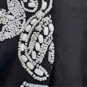 Excellent condition. Women’s Chico’s black with white beading. Beaded V-Neck, 3/4 sleeves with beaded cuffs, linen & cotton blend. Chicos size 1 (size 8-10). See photos for measurements