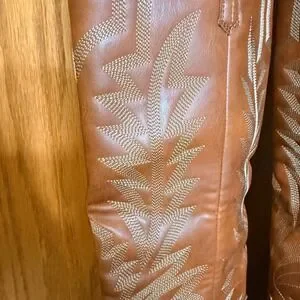 Brown faux leather tall cowboy boots with intricate embroidered stitching. These boots feature a pointed toe, a comfortable stacked heel, and a classic western silhouette. Perfect for country concerts music festivals or adding a touch of rustic charm to everyday outfits.