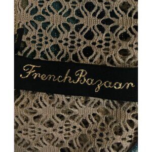 French Bazaar Top Women Size L Tan Blue Sequins Crochet Shoulders Long Sleeves